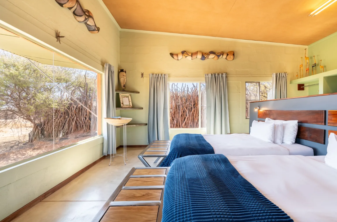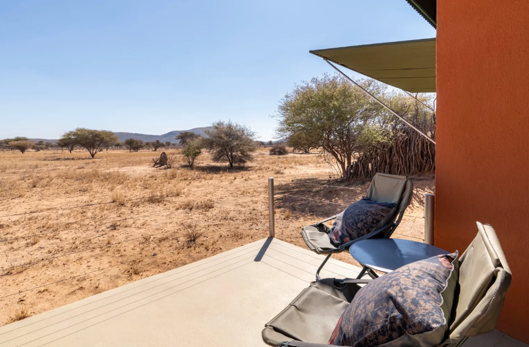 Dit is een bijzondere plek midden in de Namibische wildernis. Zodra jullie arriveren, voel je de rust en uitgestrektheid van het reservaat: golvende graslanden, verspreide acaciabomen en een zacht geluid van de natuur overal om je heen.