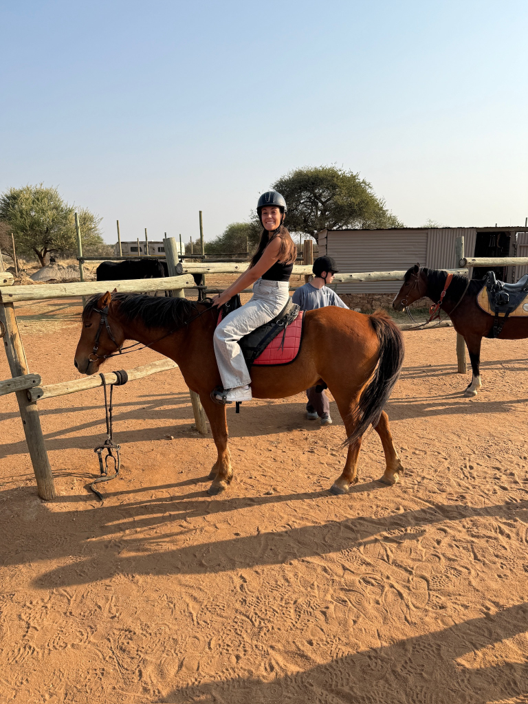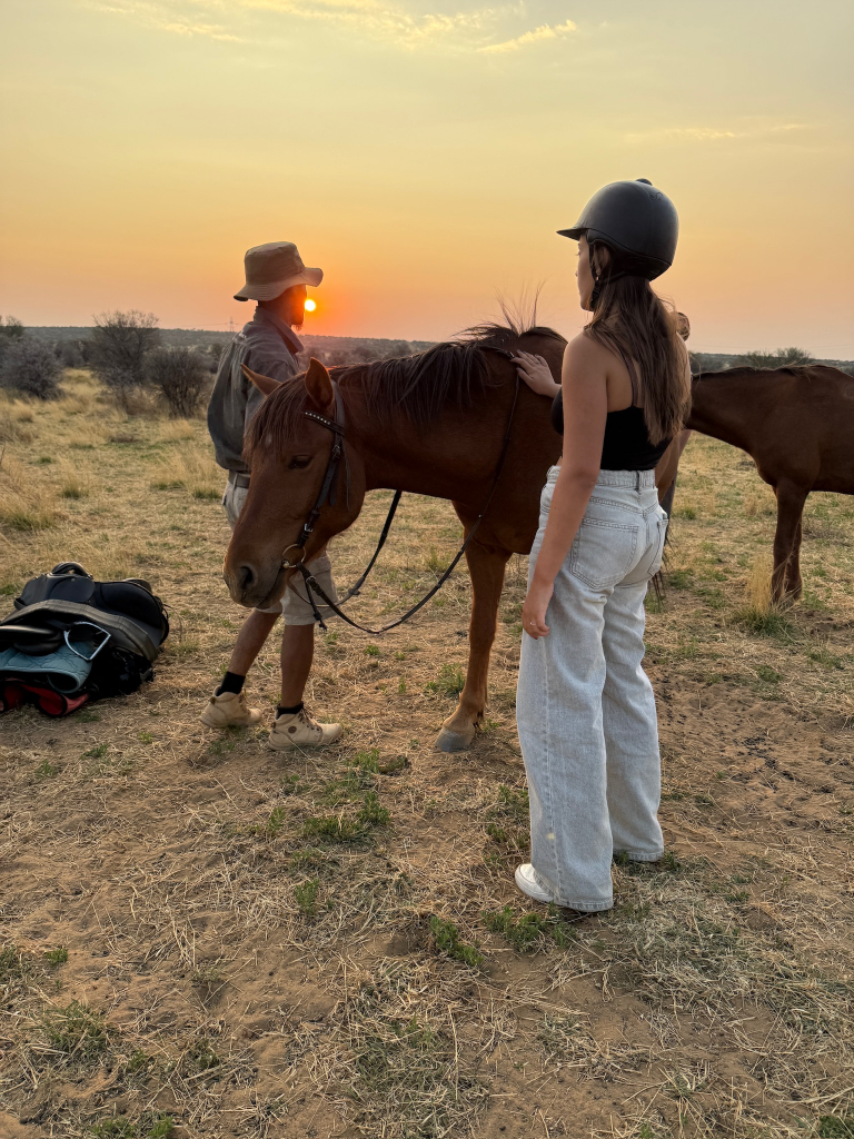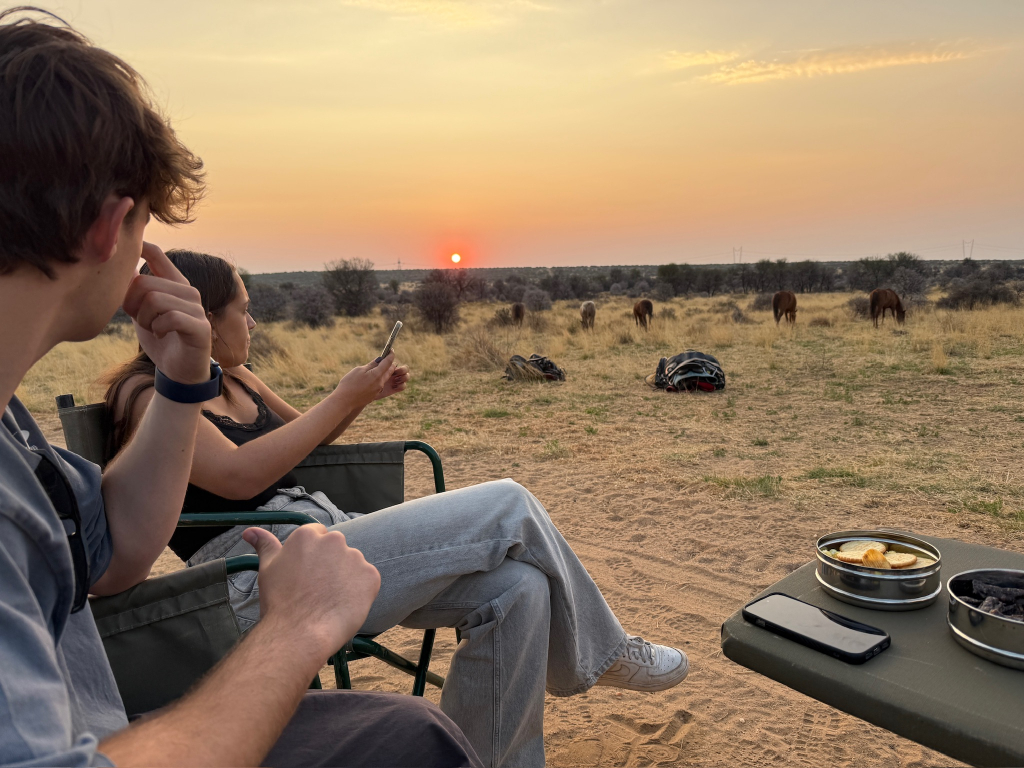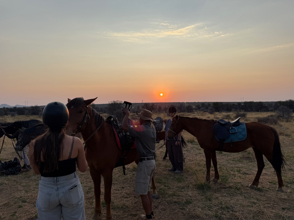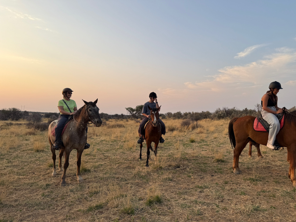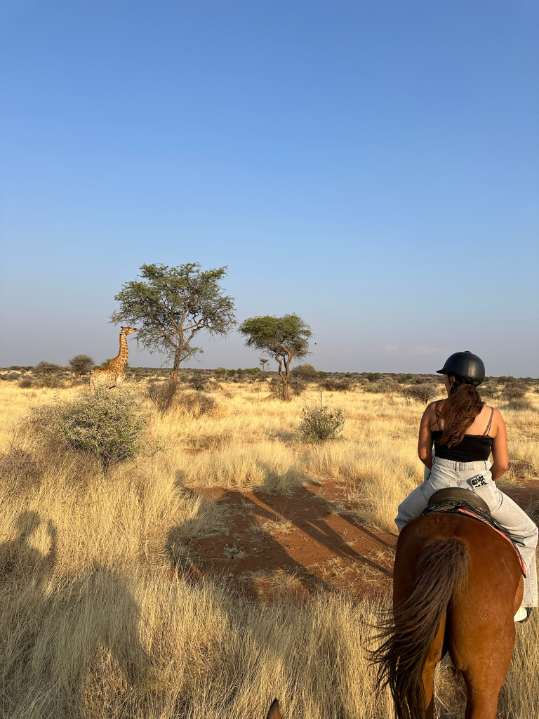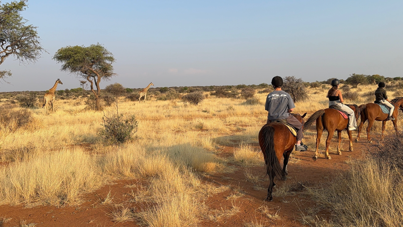 Vandaag beleven jullie een onvergetelijk avontuur te paard. Terwijl de zon langzaam zakt, galopperen jullie langs uitgestrekte vlaktes en komen jullie oog in oog te staan met een hele giraffenfamilie, inclusief nieuwsgierige kleintjes en vele andere dieren die rustig rondlopen. Het ritje eindigt bij een panoramisch uitzicht waar jullie kunnen genieten van een glaasje en smakelijke snacks terwijl de zon ondergaat.