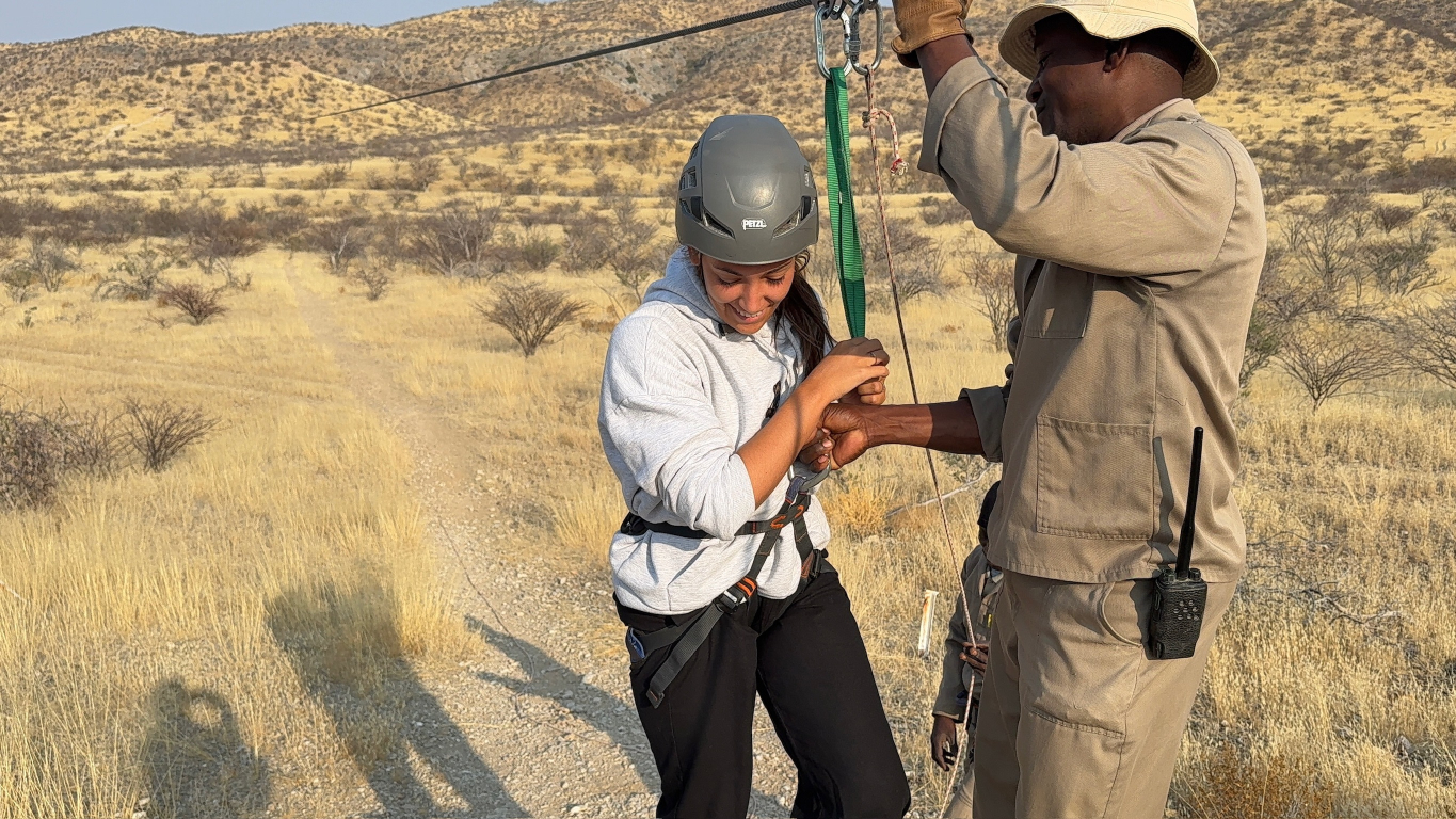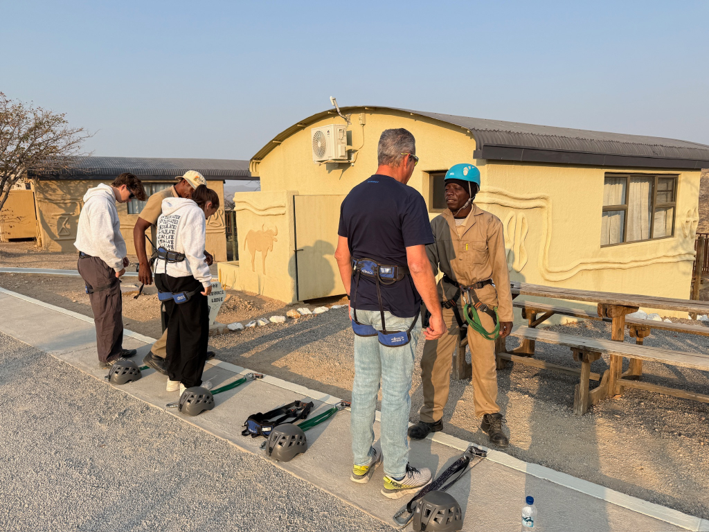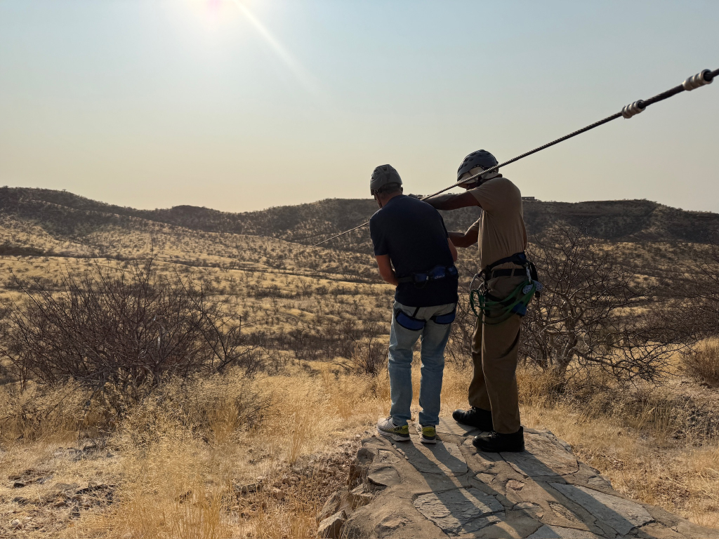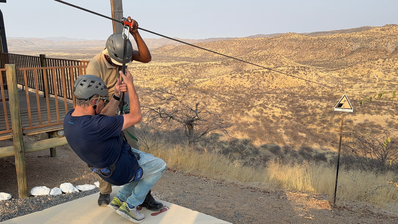 Vandaag wacht jullie een echte adrenalinekick: ziplinen hoog boven de ruige landschappen van Ugab. Eerst glijd je over de langste zipline van Namibië van maar liefst 880 meter, gevolgd door een tweede van 680 meter. Terwijl je door de lucht zoeft, geniet je van een spectaculair uitzicht over valleien en rotsformaties. Durf jij dit aan met de kinderen?